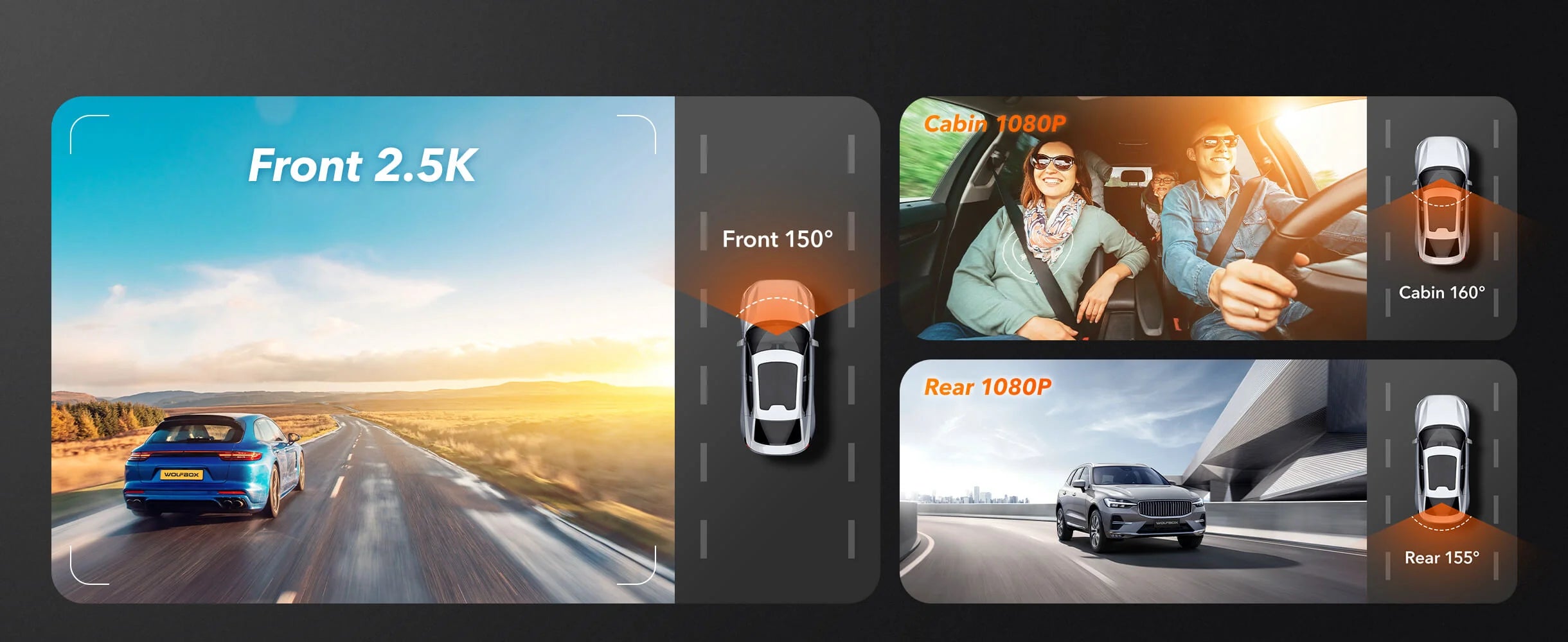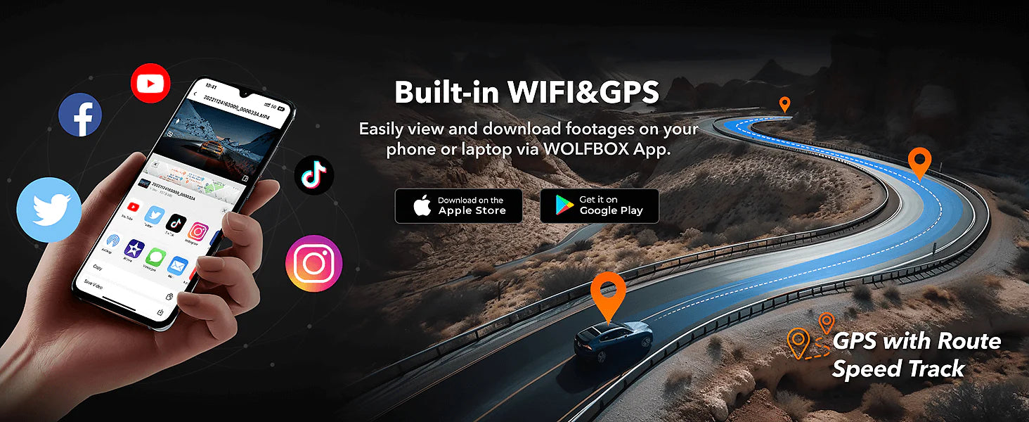 WOLFBOX i07 dash cams with WiFi and 3-channel capabilities provide easy access to recorded footage and capture video from multiple angles for added security.