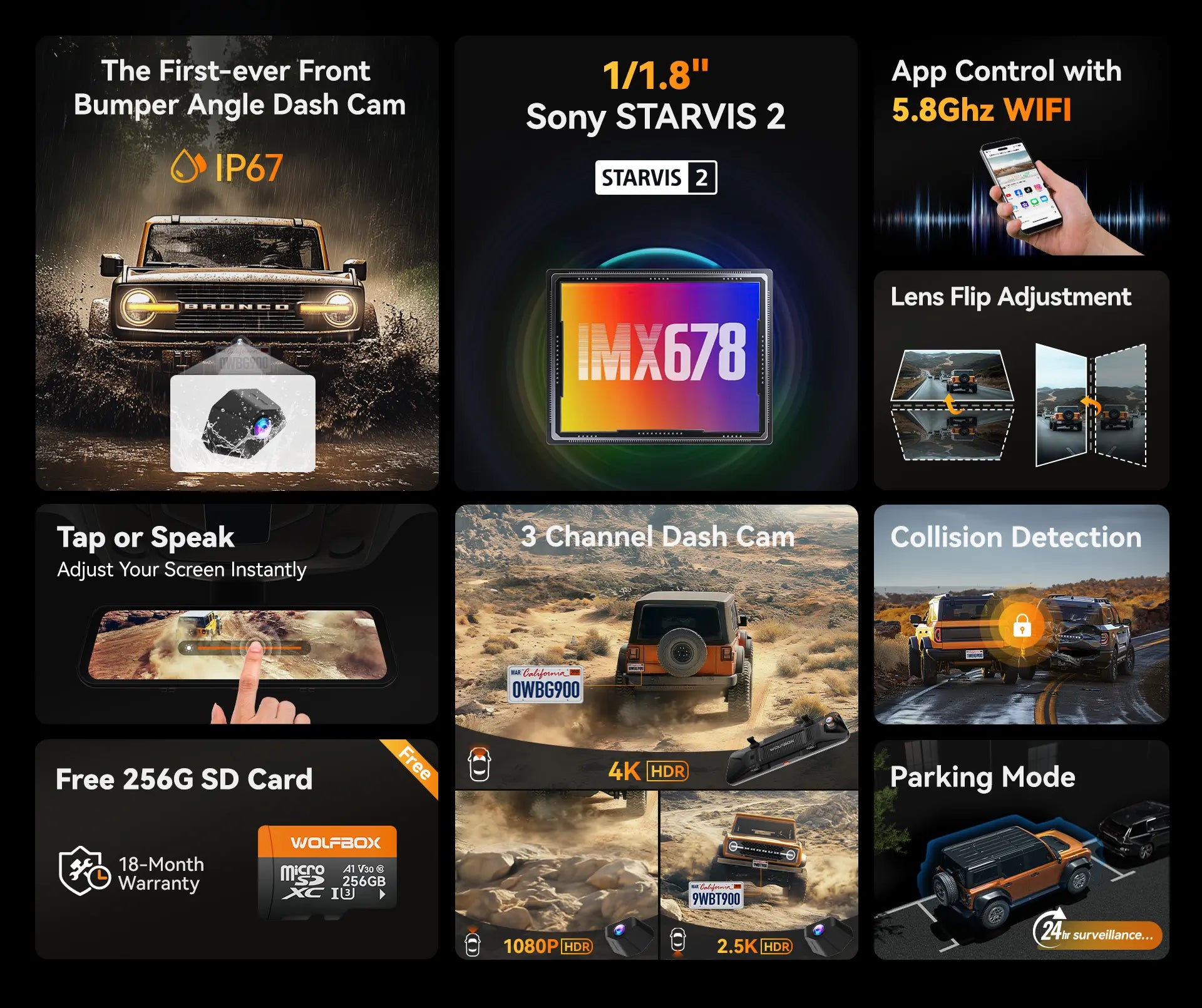 - Triple Camera System for Complete Coverage With a 3 channel system, enjoy a full driving view—4K front, 2.5K rear, and the innovative front bumper camera, ensuring no blind spots from any angle.